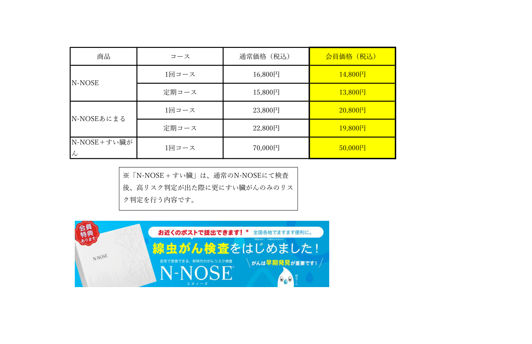 本年4月より会員の皆様の健康支援事業の一環として、がんリスクのスクリーニング検査メニュー「N-NOSE]をご案内し、多くの皆様にご利用いただいておりますが、このたび新たにペット(犬・猫)用がんリスク検査の「N-NOSEあにまる」および通常のN-NOSE検査で高リスク判定が出た際に更にすい臓がんのみのリスク判定を行う内容の「N-NOSE+すい臓がん」を取り扱うこととなりましたので、ご案内いたします。